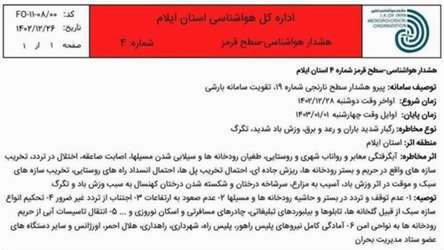 هشدار سطح قرمز شماره ۴ اداره کل هواشناسی استان ایلام در خصوص تقویت فعالیت سامانه بارشی با تاکید بر هشدار سطح نارنجی شماره ۱۹ از اواخر وقت دوشنبه ۱۴۰۲/۱۲/۲۸ لغایت اواخر وقت چهارشنبه ۱۴۰۳/۰۱/۰۱